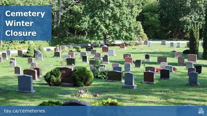 The Cemeteries will re-open on April 1, 2026, weather permitting. Residents can still contact the Clerk’s Department for general cemetery inquiries by emailing clerk@tay.ca or by calling 705-534-7248 x257 or x240.